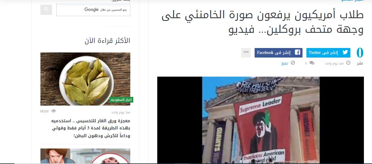 20 ثانية. المشاهد السريعة تظهر اشخاصا تجمعوا امام مبنى، قبل ان تنسدل صورة كبيرة للمرشد الاعلى للجمهورية الاسلامية الايرانية آية الله علي خامنئي على واجهته، على وقع هتافهم وتصفيقهم. وقد تكثف التشارك في الفيديو أخيرا عبر مواقع اخبارية وحسابات، عربية وأجنبية، ارفقته بالمزاعم الآتية (من دون تدخل): "متحف بروكلين في مدينة نيويورك طلبة الجامعات الامريكية يشكرون قائد الثورة الاسلامية في العالم الامام الخامنئي بعد رسالته التي وجهها لهم قبل ايام".