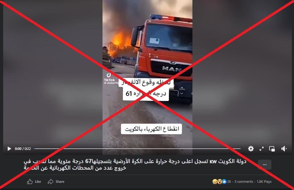 يظهر في الفيديو حريق ضخم يُحدث انفجاراً وتبدو سيارات إطفاء في المكان. وكُتب على الفيديو "لحظة وقوع انفجار في الكويت بسبب ارتفاع درجات الحرارة إلى 61 درجة مئوية".
