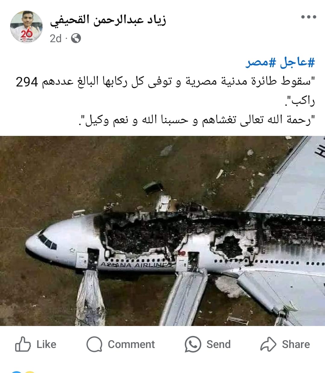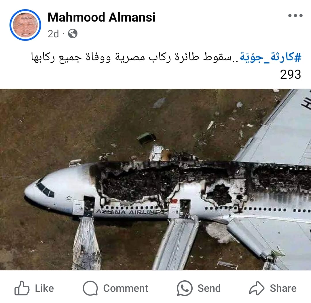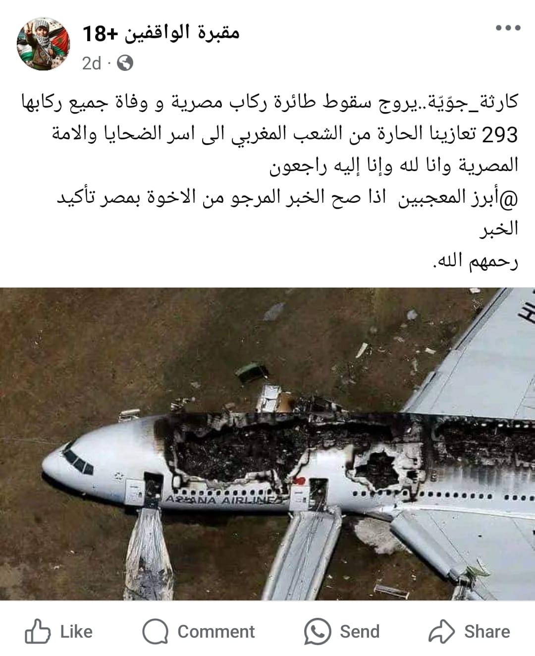 فقد نشرت تلك الحسابات، خبرا يقول (من دون تدخل): "كارثة جوية.. يروج سقوط طائرة ركاب مصرية ووفاة جميع ركابها 293 تعازينا الحارة من الشعب المغربي الى اسر الضحايا والأمة المصرية وانا لله وإنا إليه راجعون".