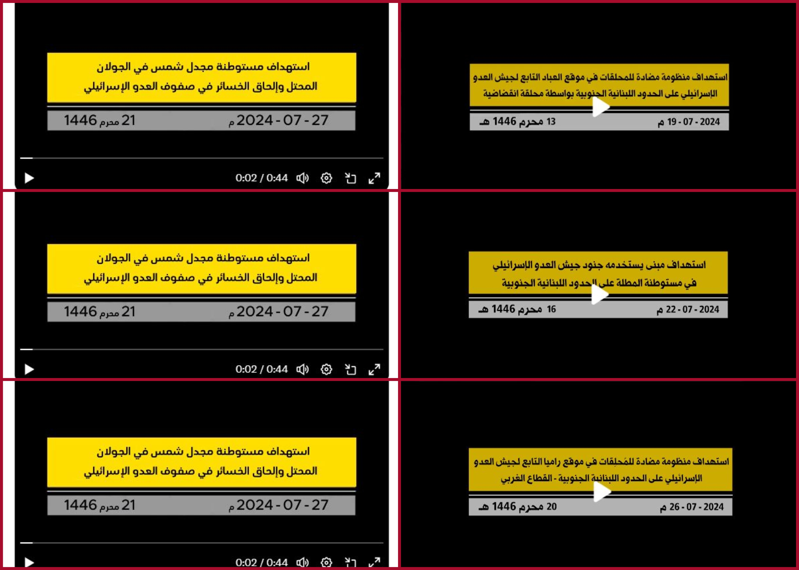 يبدأ الفيديو بشريط اصفر يعلن "استهداف مستوطنة مجدل شمس في الجولان المحتل الحاق الخسائر في صفوف العدو الاسرائيلي في 27 تموز 2027". ويتبعه مشهد لاطلاق صاروخ مع شرح قربه انه "فلق 1"، فآخر لصاروخ على ما يبدو يرتفع في السماء. وتتلاحق مشاهد أخرى لقصف في مكان وأولاد يركضون في ملعب. وقد تكثف التشارك في الفيديو أخيرا عبر حسابات ارفقته بمزاعم انه "الفيديو الذي حذفه الإعلام الحربي التابع لحزب الله بعدما تكشّف هول المجزرة" في مجدل شمس.