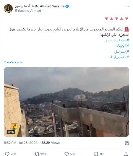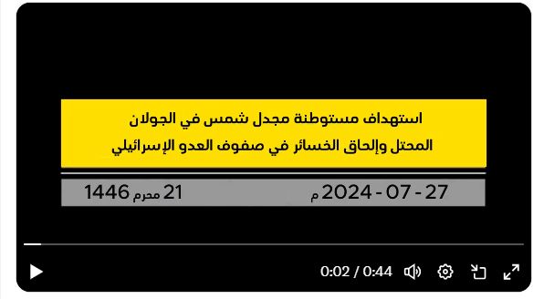 المتداول: فيديو "حذفه"، وفقاً للمزاعم، "الإعلام الحربي التابع لحزب الله، بعد قصف مجدل شمس" في الجولان المحتل، والذي أسفر عن مقتل 12 من الفتية في البلدة السبت 27 تموز 2024.