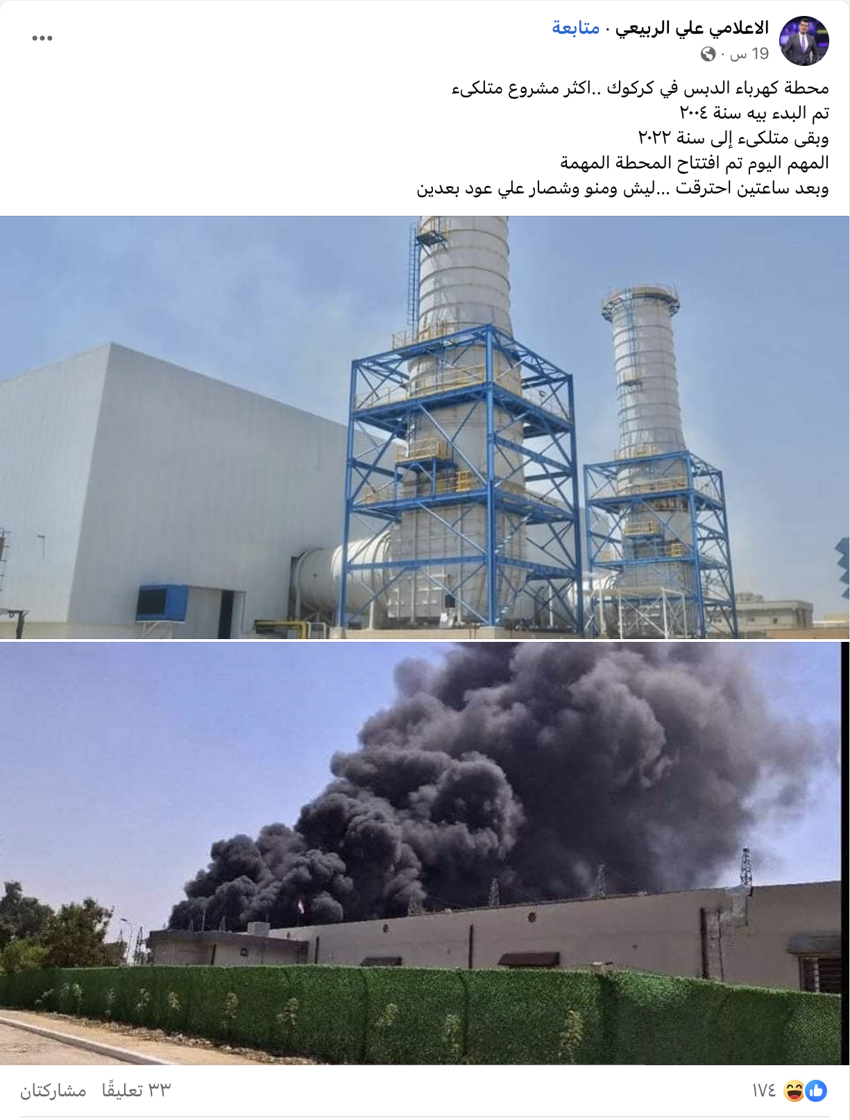 الوقائع: تكثف التشارك في الخبر في مواقع التواصل الاجتماعي أخيرا. وجاء فيه (من دون تدخل أو تصحيح): "محطة كهرباء الدبس في كركوك ..اكثر مشروع متلكىء تم البدء بيه سنة ٢٠٠٤ وبقى متلكىء إلى سنة ٢٠٢٢. المهم اليوم تم افتتاح المحطة المهمة وبعد ساعتين احترقت …ليش ومنو وشصار علي عود بعدين."