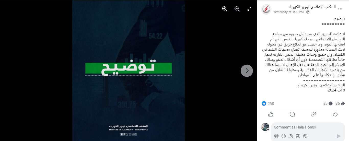 وتجدر الإشارة إلى أن المكتب الإعلامي لوزير الكهرباء نشر لاحقاً فيديو، في حسابه على موقع فايسبوك، لجولة ليلية داخل المحطة، بعنوان: "الآن محطة كهرباء الدبس تعمل بجميع وحداتها"، ما يوضح أن المحطة لم تتوقف عن العمل.