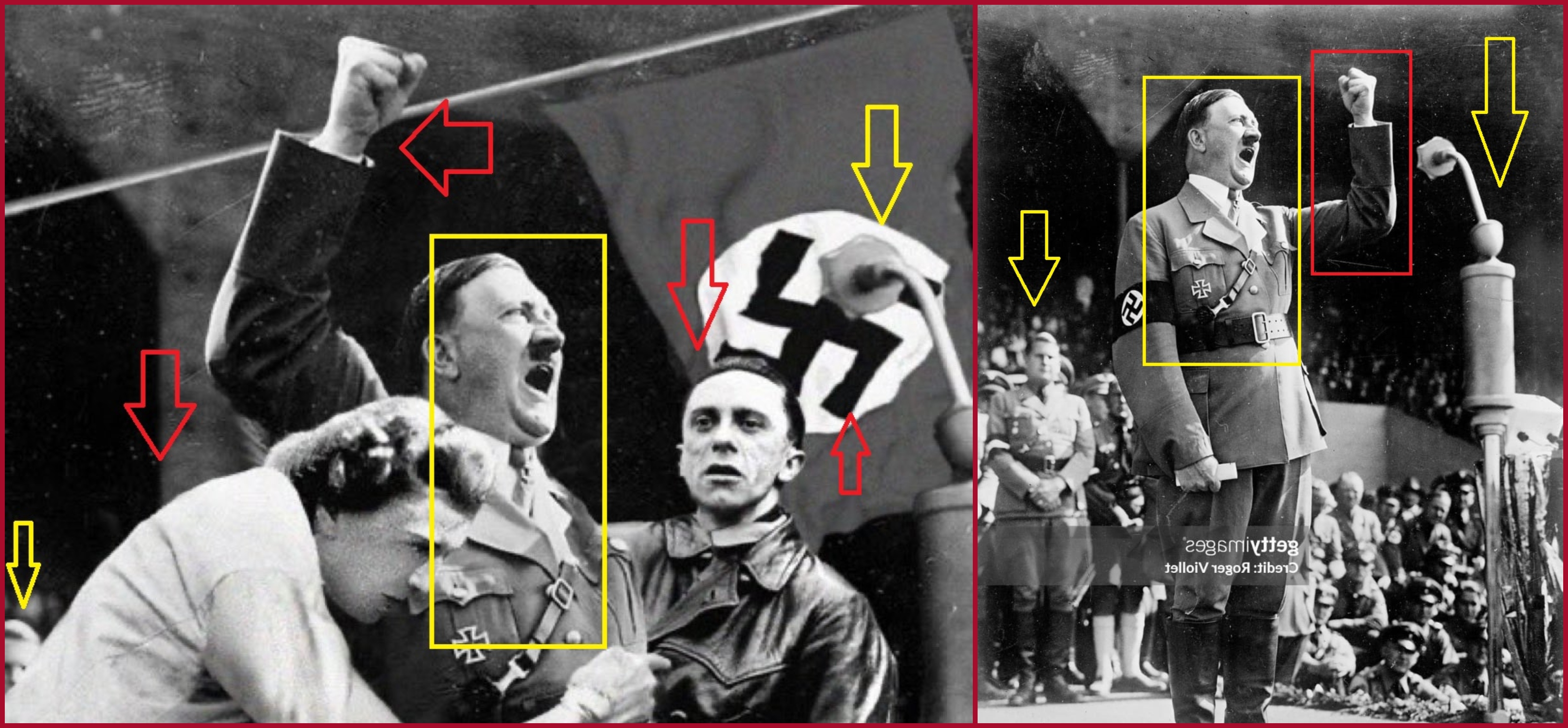وكما لاحظتم، خضعت الصورة الاصلية لتعديلات عدة: تم عكس او قلب وجهتها الى اليمين، قطع اليد اليسرى لهتلر المرفوعة (في الصورة المعكوسة) ولصقها بجهته اليمنى، إضافة علم نازي، وغوبلز والمرأة. وكانت عملية تركيب هذه الاضافات غير متقنة، اذ يمكن ملاحظة التلاعب عند الكتف اليسرى لهتلر، ويد المرأة.