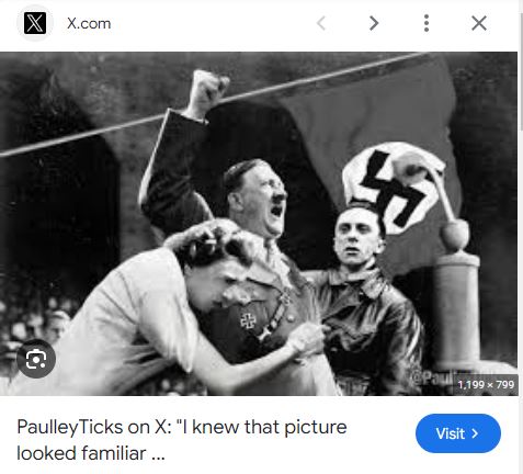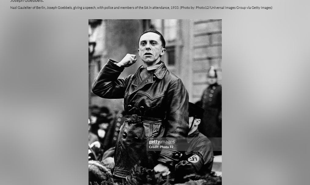 فالبحث العكسي يضعنا أولا امام صورة اصلية للسياسي الالماني النازي وزير الدعاية في حكومة هتلر جوزف غوبلز Joseph Goebbels- وهو الشخص الذي يظهر الى اليمين في الصورة المتناقلة- مؤرشفة في موقع وكالة Getty Images، مع شرح انها تظهر "غوبلز ملقيا خطابا، بحضور الشرطة وأعضاء في SA (اختصار لشتورماب تايلوغ Sturmabteilung أو كتيبة العاصفة- الجناح شبه العسكري للحزب النازي) عام 1933".