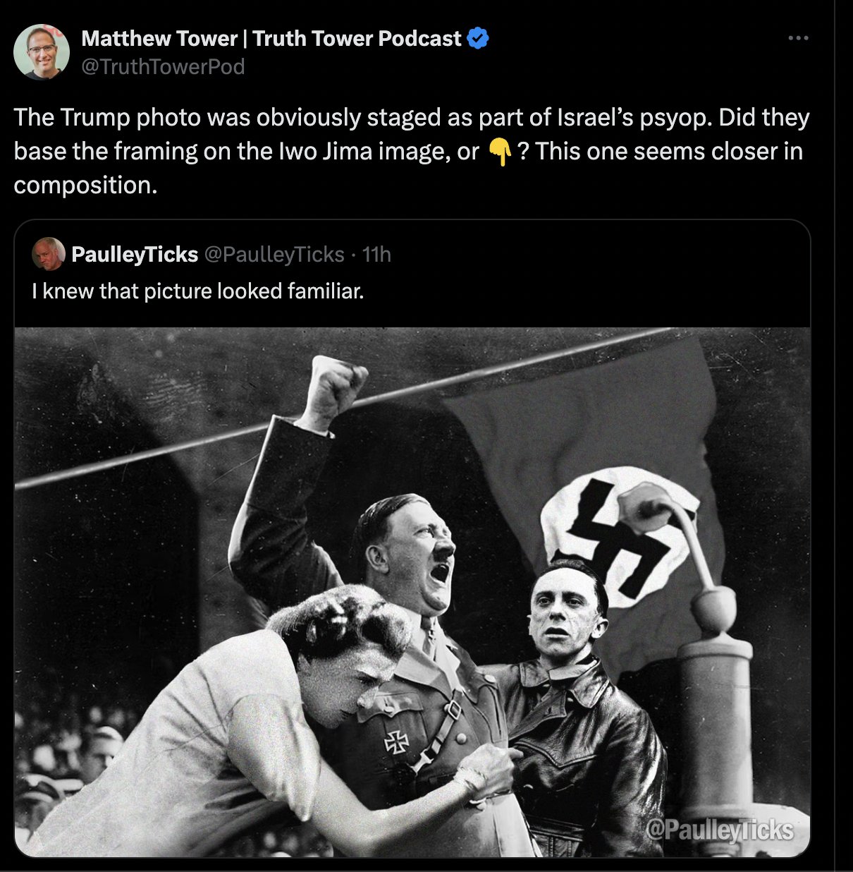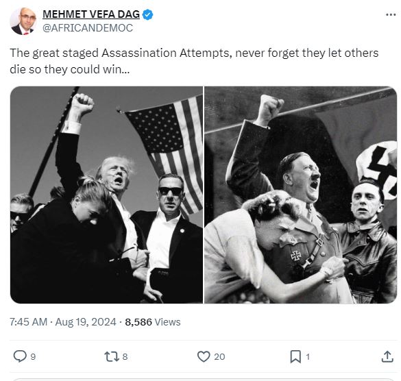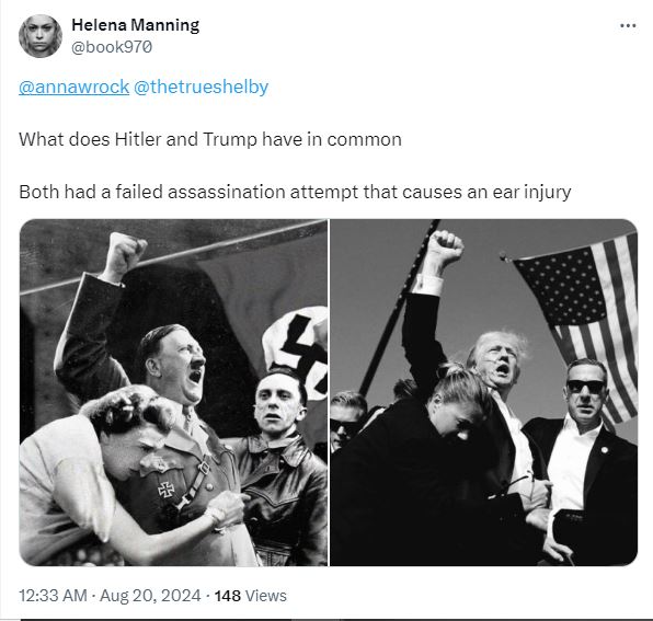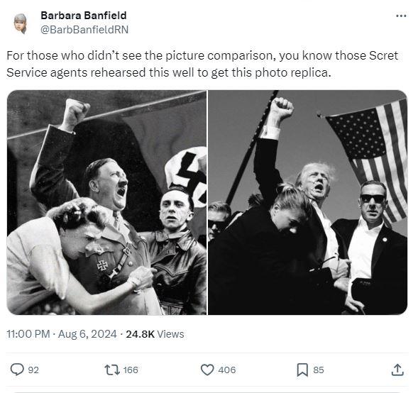 الصورة تظهر الزعيم النازي ادولف هتلر رافعا قبضته اليمنى، امام ميكروفون، بينما وقف الى يساره رجل، وانحنت قربه امرأة ممسكة به. وقد ارفقت بصورة للرئيس الاميركي السابق دونالد ترامب رافعا قبضته اليمنى ومحاطا بعملاء جهاز الخدمة السرية الاميركي، بعد محاولة اغتياله في 13 تموز 2024. واشارت حسابات الى التشابه الكبير بين صورتي ترامب وهتلر. وكتب بعضها تعليقات، مثل "محاولات الاغتيال الكبرى المدبرة، لا تنسوا أنهم سمحوا للآخرين بالموت كي يتمكنوا من الفوز"،