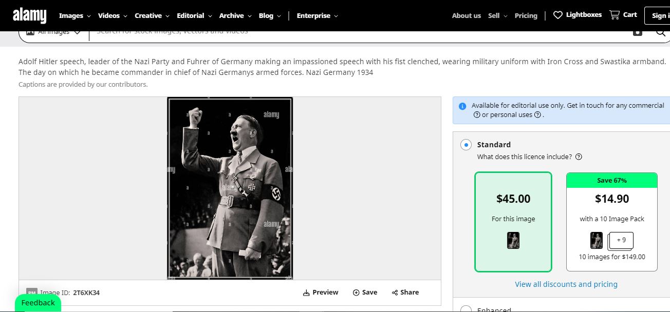 وجاء في شرح آخر للصورة في موقع Alamy لتخزين الصور: "هتلر ملقيا خطابا... في اليوم الذي أصبح فيه القائد الأعلى للقوات المسلحة في ألمانيا النازية. ألمانيا النازية 1934".