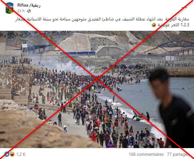 تظهر في الصورة حشود على شاطئ بحر، وسياج حديدي يفصل بين منطقتين. وقال الناشرون إن الصورة تظهر "المغاربة البارحة بعد انتهاء عطلة الصيف في شاطئ الفنيدق متوجهين سباحة نحو سبتة الإسبانية".