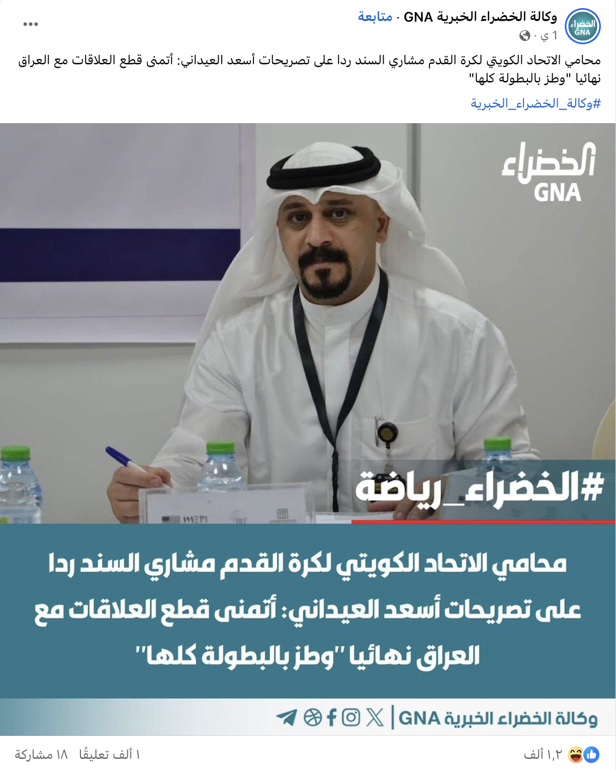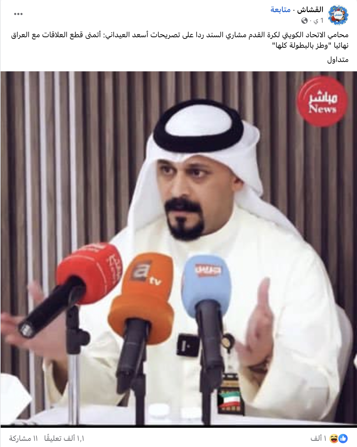 الوقائع: تكثف التشارك في الخبر أخيرا في مواقع التواصل الاجتماعي. وجاء فيه (من دون تدخل أو تصحيح): "محامي الاتحاد الكويتي لكرة القدم مشاري السند ردا على تصريحات أسعد العيداني: أتمنى قطع العلاقات مع العراق نهائيا وطز بالبطولة كلها".
