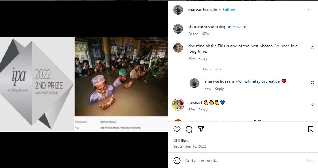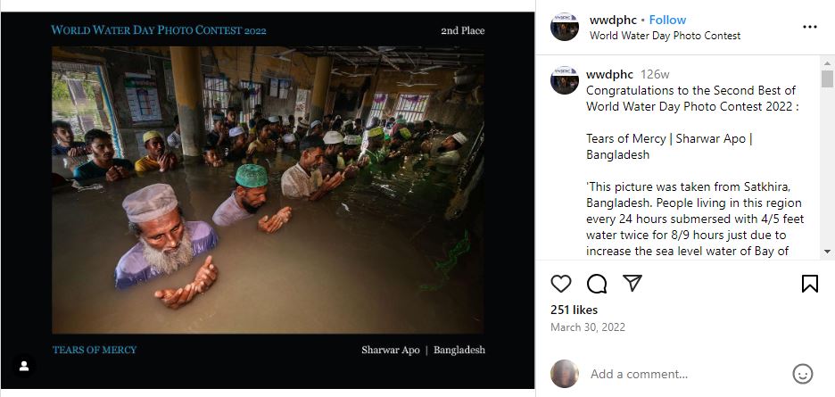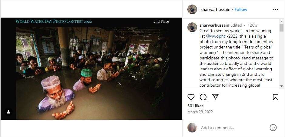 بحثاً عن المصوّر شاروار حسين، نعثر على حسابه في انستغرام، حيث نشر الصورة في 29 آذار 2022، معلنا فوزها بالمرتبة الثانية في مسابقة صور يوم المياه العالمي World Water Day Photo Contest (wwdphc 2022).
