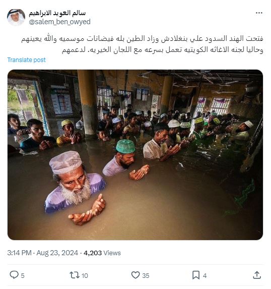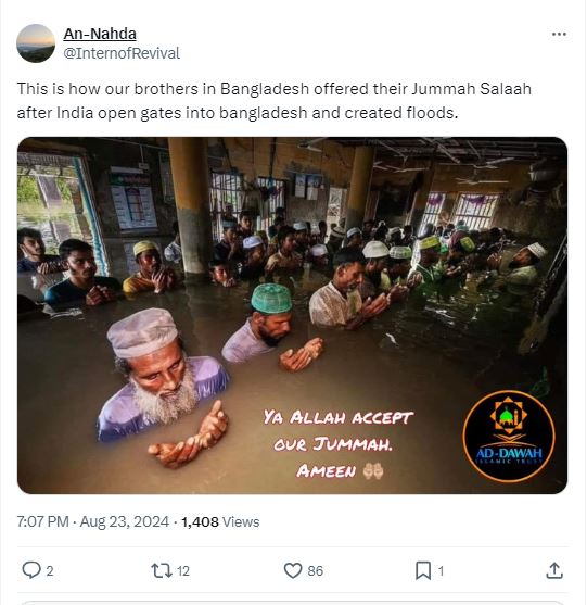 تظهر الصورة رجالا وقفوا مصلين في قاعة غارقة في المياه، وقد وصلت الى صدورهم. وقد تكثف التشارك فيها أخيرا عبر حسابات، عربية وأجنبية، ارفقتها بتعليقات مثل "هكذا أدى إخواننا في بنغلادش صلاة الجمعة بعدما فتحت الهند أبوابها عليها وأحدثت الفيضانات"، و"نسأل الله أن يحفظ بنغلادش من هذه الفيضانات".