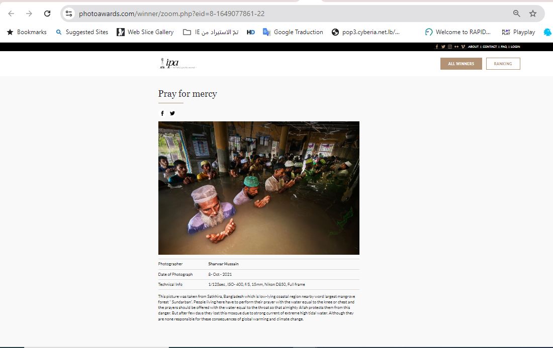 ووفقا لشرح ارفقه بالصورة، "التُطقت في ساتخيرا Satkhira ببنغلادش، وهي منطقة ساحلية منخفضة بالقرب من سونداربان، أكبر غابة مانغروف. وعلى الناس الذين يعيشون هناك أداء صلاتهم وسط ماء يصل الى الركبة أو الصدر، ويجب تقدمة الصلوات وسط ماء يصل الى الحلق، كي يحميهم الله من هذا الخطر. ولكن بعد أيام قليلة، فقدوا هذا المسجد بسبب التيار القوي لمياه المد العالي، على الرغم من أنهم ليسوا مسؤولين عن هذه العواقب المترتبة على الانحباس الحراري العالمي وتغيّر المناخ".