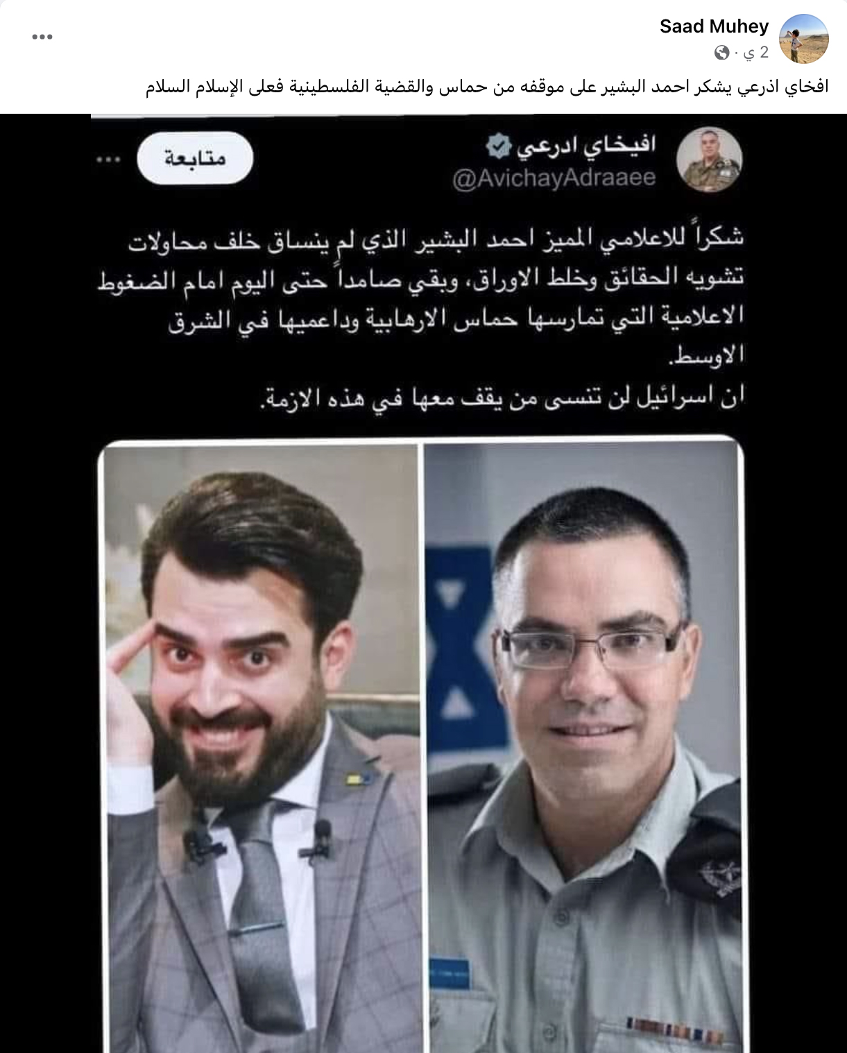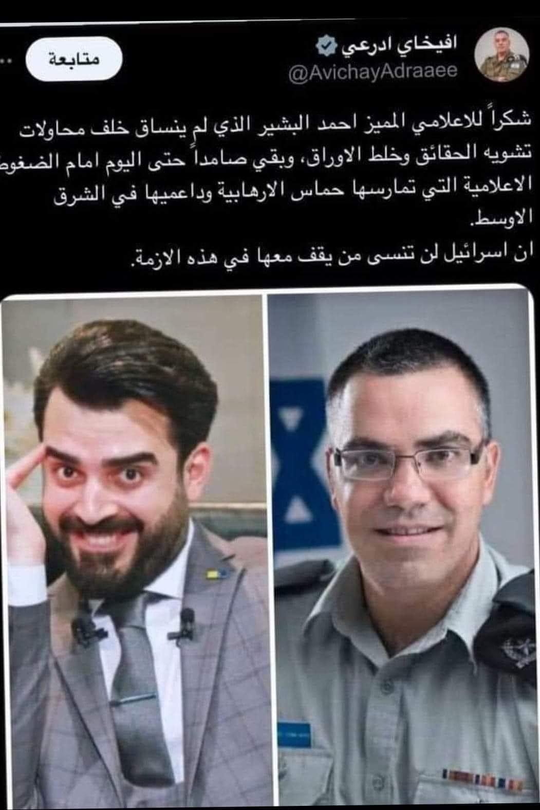 يتداول مستخدمون لمواقع التواصل الاجتماعي تغريدة تزعم أنها "للمتحدث باسم جيش الدفاع الإسرائيلي أفيخاي أدرعي، يشكر فيها الإعلامي العراقي الساخر أحمد البشير بالتزامن مع انطلاق برنامجه الشهير البشير شو، ووفقاً للتغريدة المزعومة، فإن أدرعي أثنى على موقف البشير الذي لم ينساق خلف محاولات تشويه الحقائق وخلط الأوراق، مشيراً إلى أن إسرائيل لن تنسى من يقف معها في هذه الأزمة". غير أنّ هذا الزعم غير صحيح، والتغريدة المتناقلة مزيفة. #FactCheck