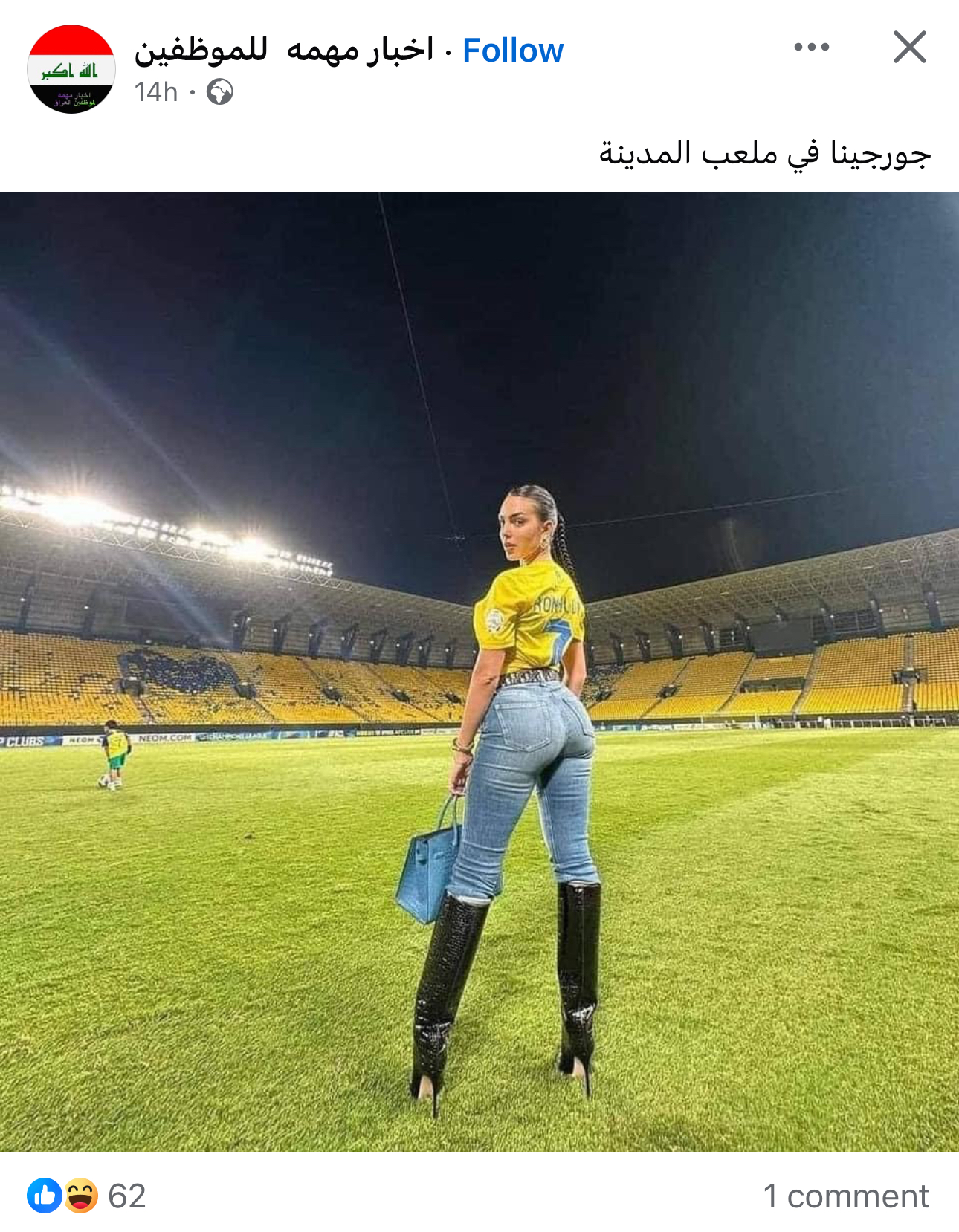 تظهر الصورة جورجينا رودريغيز واقفة وسط ملعب كرة القدم. وقد أُرفقت بالمزاعم الآتية (من دون تدخل أو تصحيح): "جورجينا في ملعب المدينة".