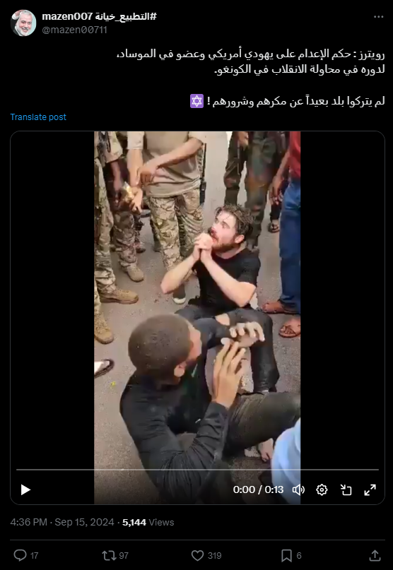 13 ثانية فقط. المشاهد تظهر رجلين جلسا ارضا، بينما تحلق حولهما عسكريون واشخاص. وبينما يتم تقييد يدي أحدهما، يقف الآخر رافعا يديه. وقد انتشر الفيديو خلال الساعات الماضية في حسابات ارفقته بالمزاعم الآتية (من دون تدخل): "عاجل- رويترز: حكم الإعدام على يهودي أمريكي وعضو في الموساد، لدوره في محاولة الانقلاب في الكونغو - قاضي المحكمة العسكرية".