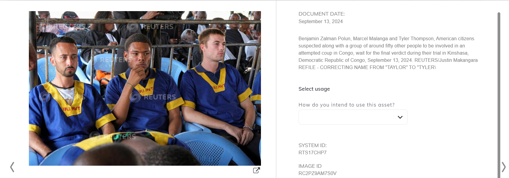 المتداول: فيديو يظهر رجلين يتم تقييدهما، مرفقاً بخبر يدّعي ان وكالة "رويترز نشرت أنه صدر حكم بإعدام يهودي أميركي هو عنصر في الموساد الاسرائيلي لدوره في محاولة الانقلاب في الكونغو الديموقراطية".