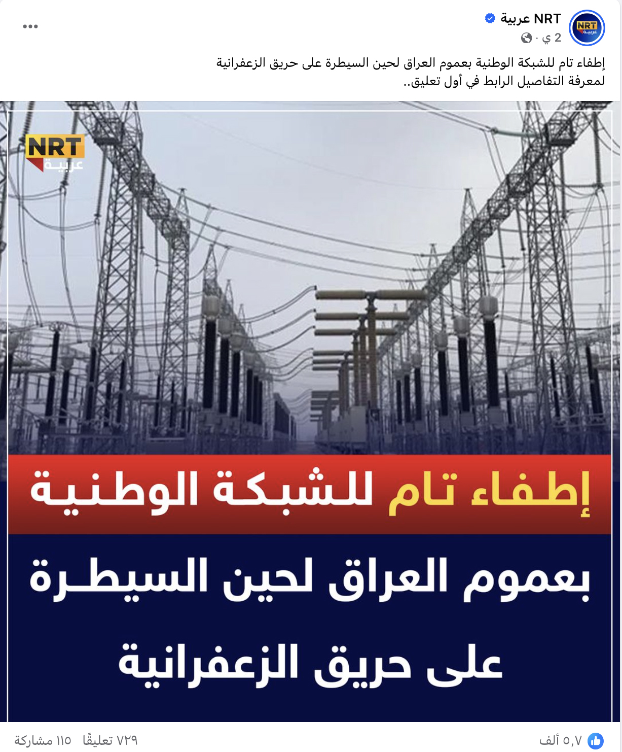 تكثف التشارك في الخبر أخيرا في مواقع التواصل الاجتماعي. وجاء فيه (من دون تدخل): "يحدث الآن، حريق محطة كهرباء الزعفرانية يسبب إطفاء شاملا لشبكات العراق الكهربائية. وارسلت مديرية الدفاع المدني 40 عجلة إطفاء لمكافحة الحريق ومباشرة عمليات الإخماد".