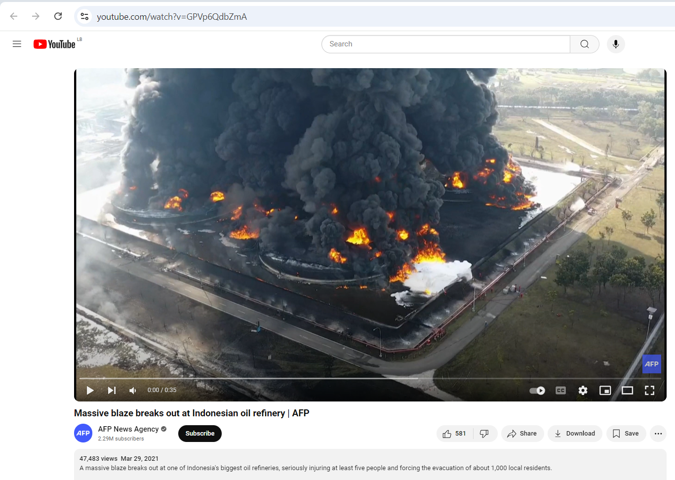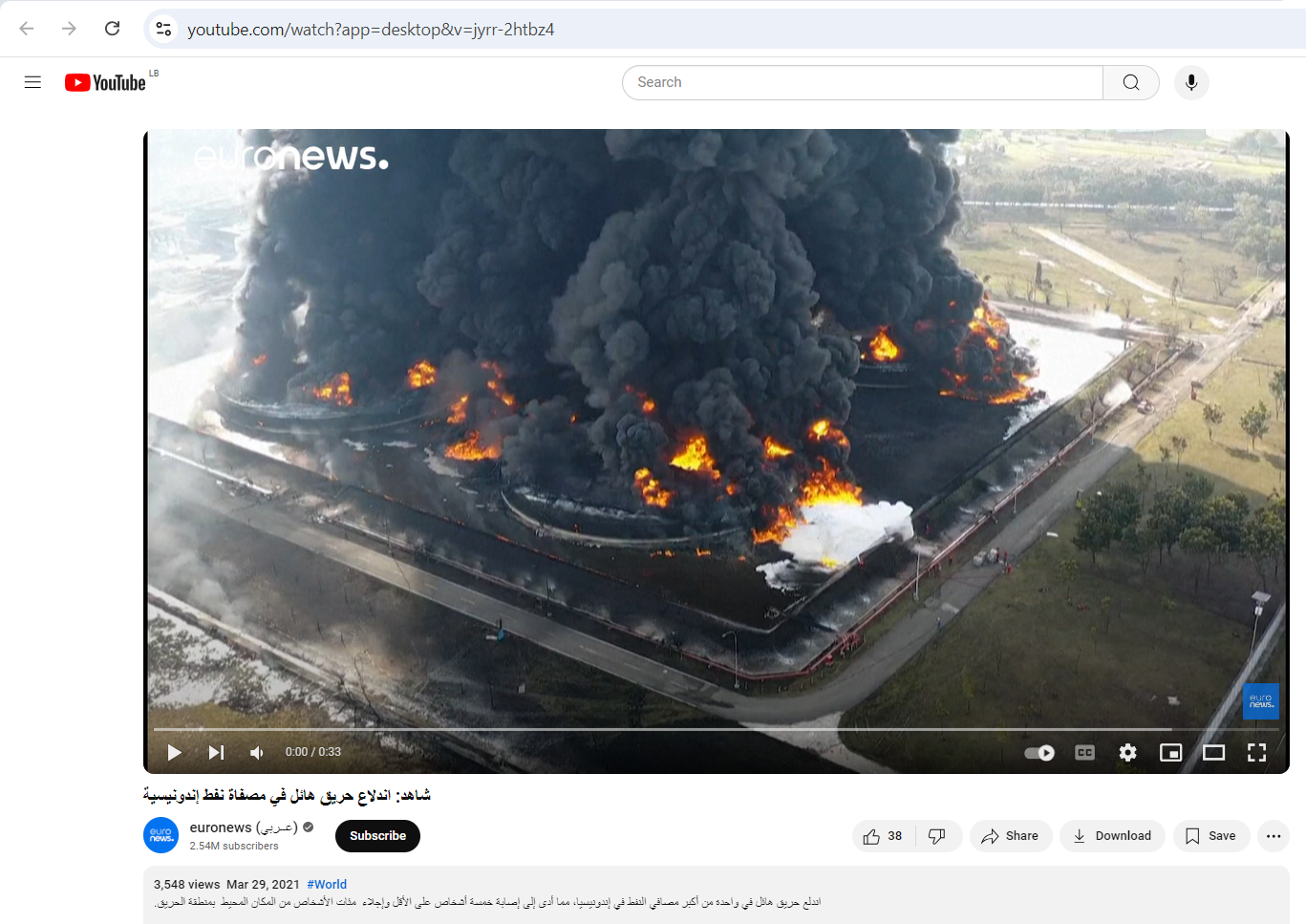 فالبحث عنه، بتجزئته الى مشاهد ثابتة (Invid)، يوصلنا اليه منشورا في حساب قناة Euronews (عربي) في يوتيوب، في 29 آذار 2021، بعنوان: "شاهد اندلاع حريق هائل في مصفاة نفط إندونيسية".