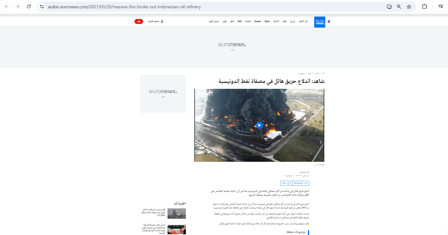 وأوردت القناة في تقرير انه اندلع حريق هائل في واحدة من أكبر مصافي النفط في إندونيسيا، مما أدى إلى إصابة خمسة أشخاص. وتم إجلاء ما لا يقل عن 500 شخص من قرية قريبة بعد اندلاع حريق هائل في مصفاة بيرتامينا بالونغان في مقاطعة جاوا الغربية بإندونيسيا.