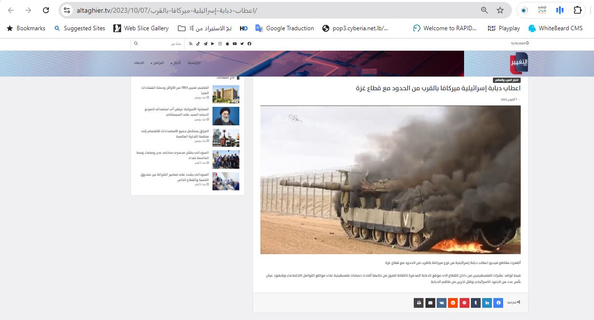 فالبحث العكسي يوصلنا أولا الى مواقع اخبارية عدة نشرتها في 7 تشرين الاول 2023، يوم الهجوم غير المسبوق الذي نفّذه عناصر حركة حماس على جنوب إسرائيل. وكتب احدها معها: "اعطاب دبابة ميركافا إسرائيلية بالقرب من الحدود مع قطاع غزة".