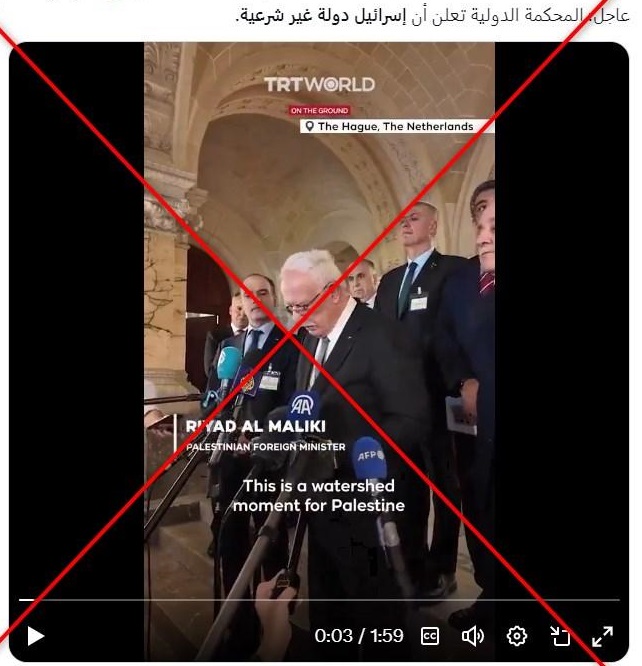 يُظهر الفيديو مستشار رئيس السلطة الفلسطينيّة رياض المالكي وهو يُطلع وسائل الإعلام على حكم لمحكمة العدل الدولية، بحسب وسائل الإعلام التي نشرت مقاطع من كلمته التي ألقاها من لاهاي في هولندا في التاسع عشر من شهر تموز الماضي.