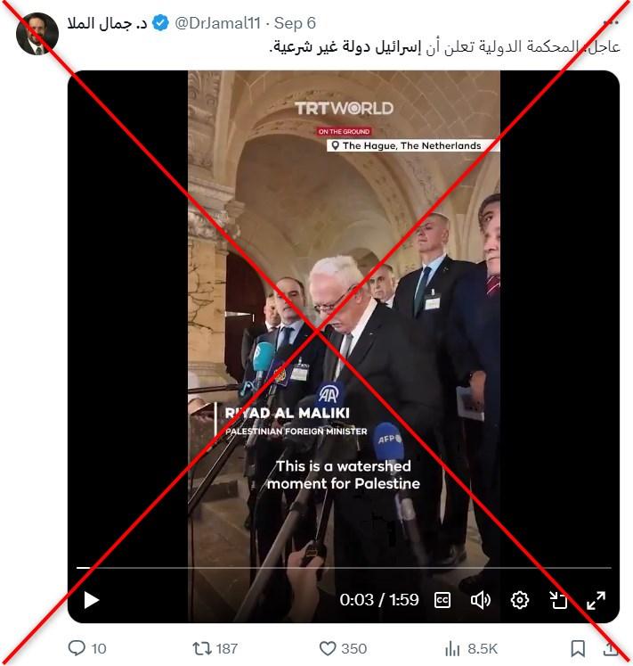 تضمّنت المنشورات، إمّا صورة، إما مقطع فيديو لمستشار رئيس السلطة الفلسطينيّة رياض المالكي وهو يلقي كلمة للصّحافيين. وعلّق الناشرون بالقول: "تمّ إعلان إسرائيل دولة غير شرعيّة من قبل محكمة العدل الدولية. وتقرر أيضًا عدم الاعتراف بها كدولة ذات سيادة في جميع أنحاء العالم، وفي النهاية انتصرت العدالة".