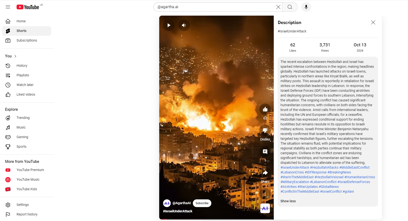 فالبحث عنه، بتجزئته الى مشاهد ثابتة (Invid)، يوصلنا فورا الى مصدره الاصلي، وكالة التصميم الابداعي agartha.ai، التي نشرته في حسابيها في يوتيوب واكس، في 13 تشرين الاول 2024، بعنوان: Israel Under Attack، اي اسرائيل تحت هجوم.