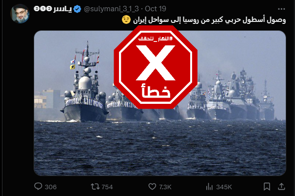 تظهر الصورة مجموعة سفن تبحر معا. وقد نشرتها أخيرا حسابات بالمزاعم الآتية (من دون تدخل): "وصول أسطول حربي كبير من روسيا إلى سواحل إيران".