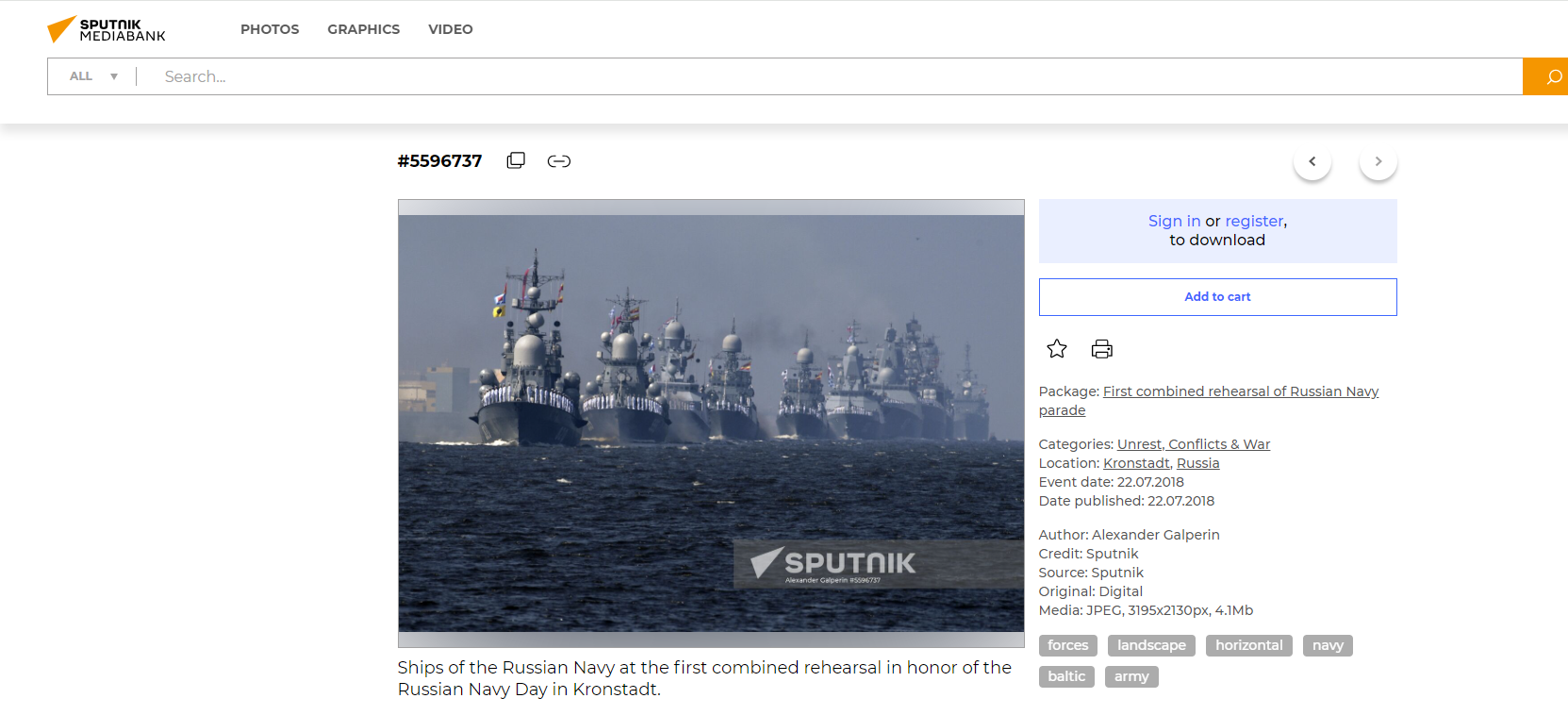فالبحث العكسي يوصلنا الى وكالة "سبوتنيك" التي نشرتها في 22 تموز 2018، مع الشرح الآتي: "سفن البحرية الروسية في أول تدريب مشترك في كرونشتادت Kronstadt، في مناسبة يوم البحرية الروسية (الصورة في وكالة ريا نوفوستي).
