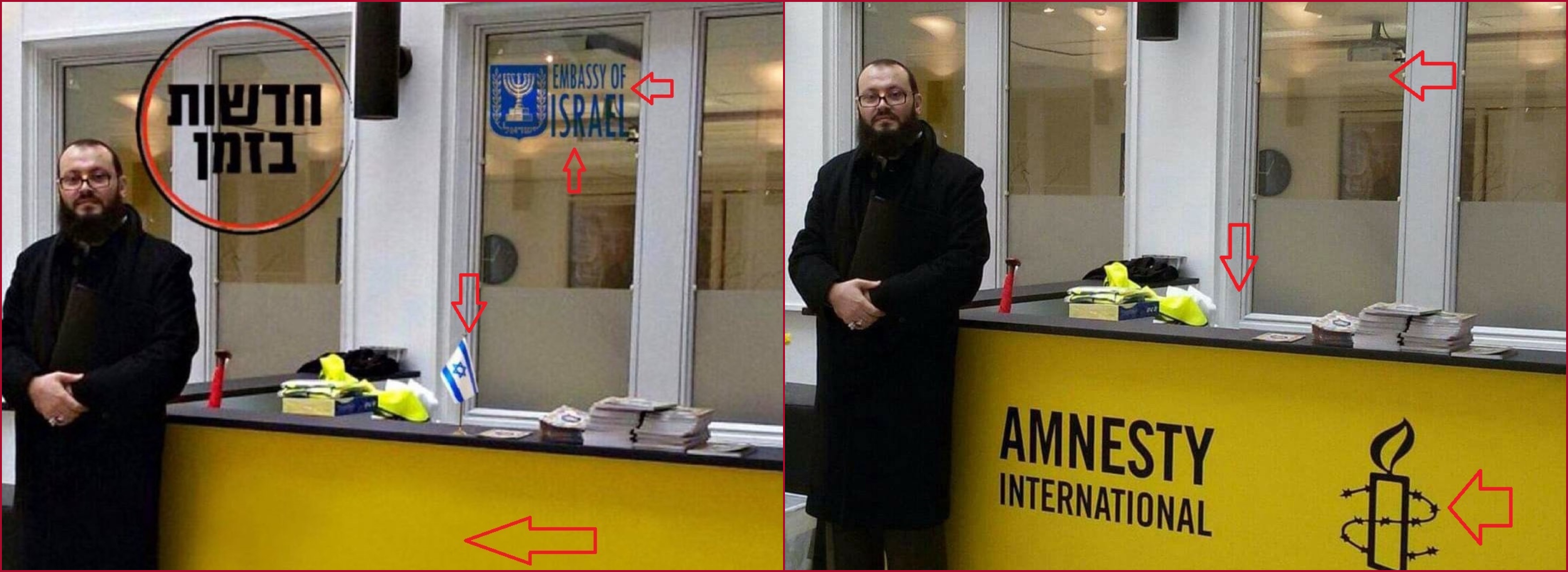 ونشاهد في الصورة الاصلية شعار منظمة العفو الدولية Amnesty International مكتوبا على الاطار الاصفر للمكتب، بينما خلا الزجاح الخلفي من اي كتابة عليه، ولا اثر للعلم الاسرائيلي الصغير على المكتب.