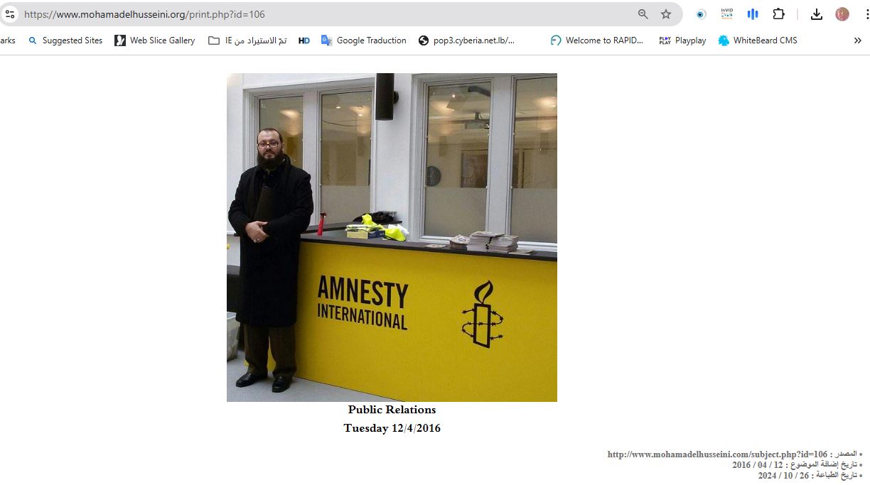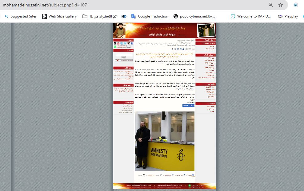 ووفقا لموقع الحسيني، تظهره الصورة خلال زيارته مقر منظمة العفو الدولية في اوروبا. يومذاك، قال إنه "من المهم جدا ان نتعرف ونزور المؤسسات والجمعيات المختصة بحقوق الإنسان في العالم، ونساعدها وندعمها ونتعاون معها من باب قوله تعالى:"وتعاونوا على البر والتقوى"، لما فيه من فائدة مرجوة لتحسين وتحصين حقوق الإنسان المهدورة خاصة في الشرق الأوسط".