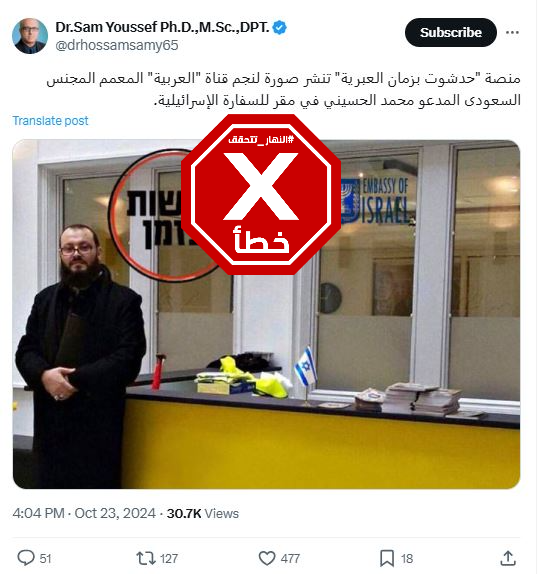 هذه الصورة زائفة ولا تظهر محمد علي الحسيني في سفارة إسرائيليّة FactCheck#