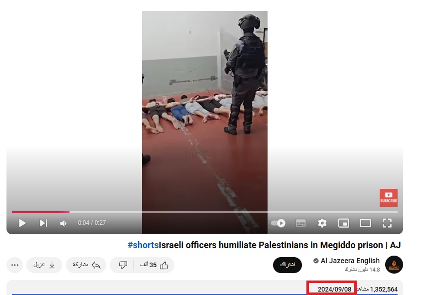 ولكن البحث العكسي قاد إلى أن هذه المزاعم مضللة تماما، إذ كشف تحليل الفيديو وتفكيكه إلى مجموعة صور أنه يعود إلى 8 أيلول (سبتمبر) 2024، ويظهر معتقلين فلسطينيين في سجن مجيدو الإسرائيلي.
