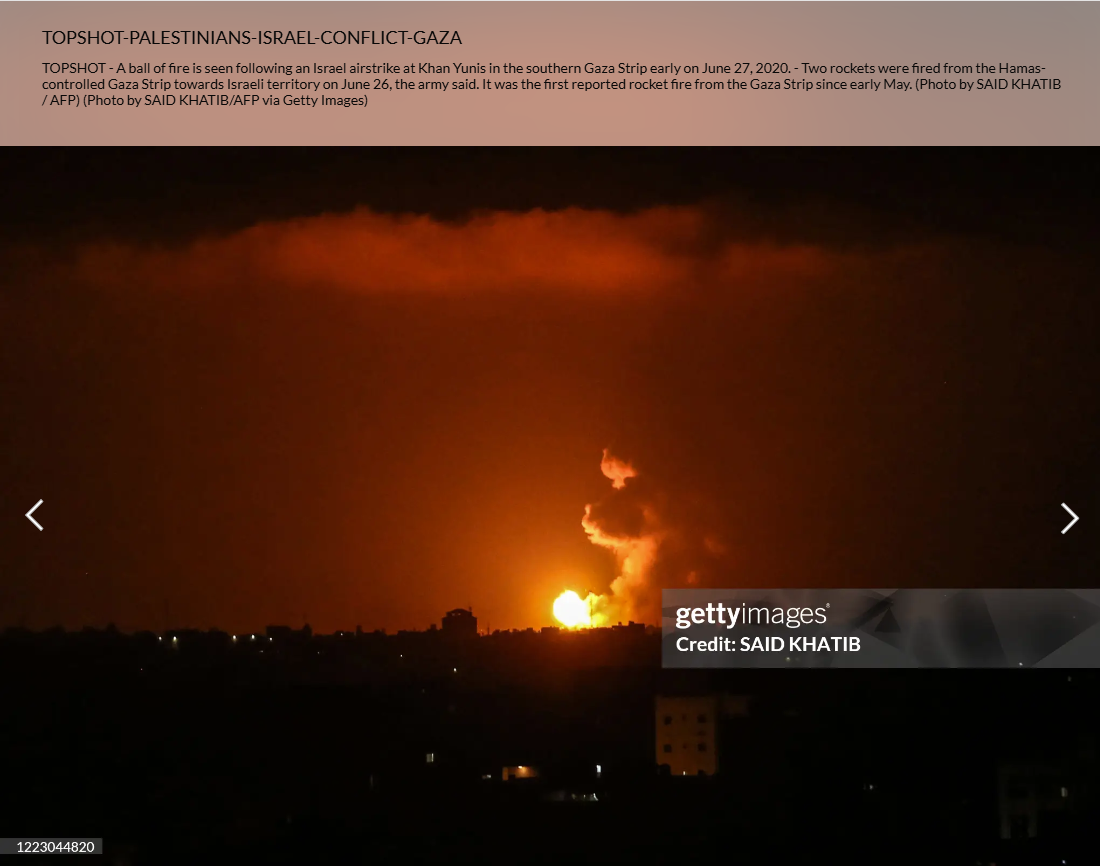 فالبحث العكسي يوصلنا اليها مؤرشفة في موقع وكالة غيتي ايماجيز Getty Images، مع شرح انها تظهر "كرة نار تشكلت إثر غارة جوية إسرائيلية على خان يونس جنوب قطاع غزة في ساعة مبكرة من صباح 27 حزيران 2020".