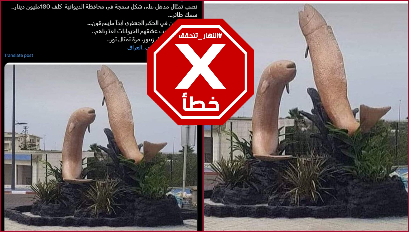 يظهر في الصورة ما يبدو أنّهما تمثالان لسمكتين في ما يبدو أنّها ساحة. وأرفقت الصورة بتعليقات تزعم أن هذين التمثالين مُقامان في محافظة الديوانيّة في جنوب العراق، وأّنهما كلّفا 137 ألف دولار.