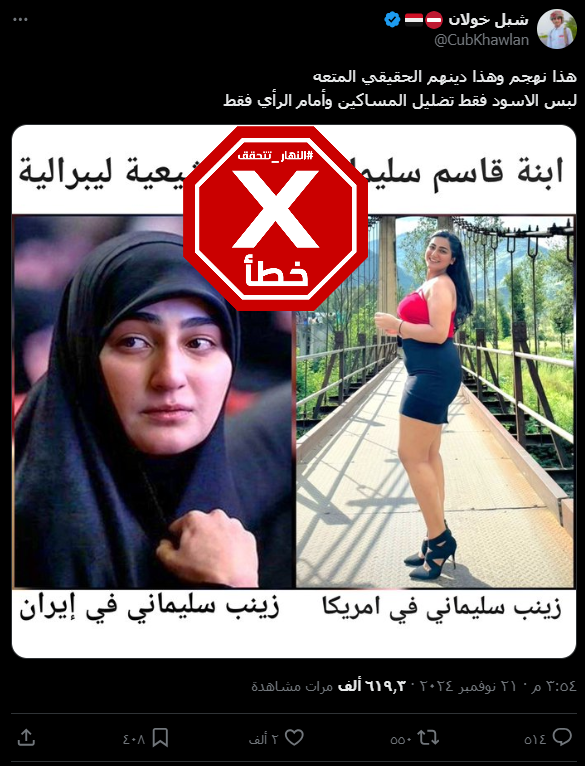 تظهر المنشورات المتداولة صورة لزينب سليماني، ابنة سليماني الذي اغتيل في مطار بغداد بغارة جويّة أميركية عام 2020، الى جانب صورة لفتاة ترتدي ملابس قصيرة، ومن دون الحجاب الإسلامي الذي ترتديه سليماني عادة، وذلك بمزاعم أنّ سليماني تظهر بملابس مختلفة في أميركا. وعلّقت حسابات: "هذا نهجم وهذا دينهم الحقيقي. المتعة لبس الاسود فقط لتضليل المساكين وأمام الرأي".