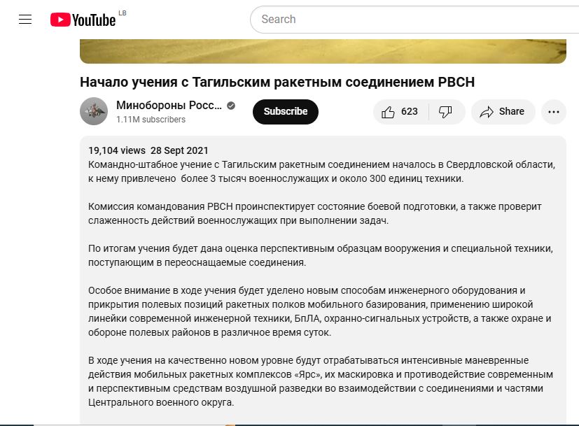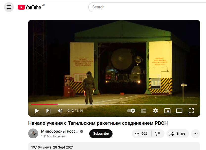 فالبحث عنه، بتجزئته الى مشاهد ثابتة (Invid)، يوصلنا عبر محرك Yandex، الى المقطع منشورا بنسخة أطول وبنوعية أفضل (1.14 دقيقة) في حساب وزارة الدفاع الروسية في يوتيوب، في 28 ايلول 2021، بعنوان (بالروسية):  Начало учения с Тагильским ракетным соединением РВСН، اي بدء التدريبات مع وحدة تاجيل الصاروخية التابعة لقوات الصواريخ الاستراتيجية.