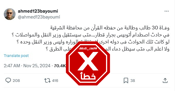 فقد انتشر على موقع التدوينات القصيرة إكس خبر يقول (من دون تدخل): "وفاة 30 طالب وطالبة من حفظه القرآن من محافظة الشرقية في حادث اصطدام أتوبيس بجرار قطار".
