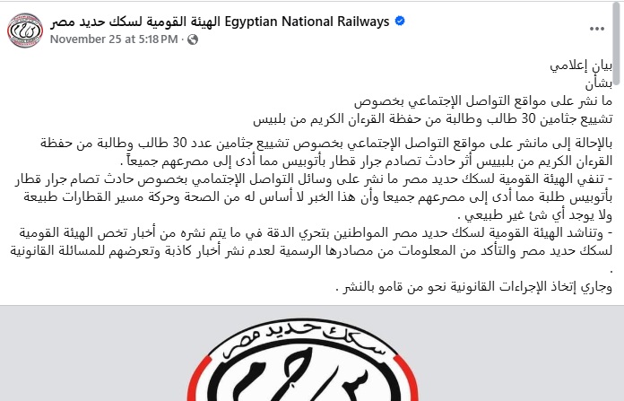 كذلك، أصدرت الهيئة بيانا نفت فيه رسميا وقوع مثل هذا الحادث. وقالت: "بالإحالة على ما نشر على مواقع التواصل الاجتماعي بخصوص تشييع جثامين عدد 30 طالب وطالبة من حفظة القرآن الكريم من بلبييس (محافظة الشرقية)، إثر حادث تصادم جرار قطار بأتوبيس، مما أدى إلى مصرعهم جميعاً، تنفي الهيئة ما نشر على وسائل التواصل الاجتماعي بخصوص حادث تصام جرار قطار بأتوبيس طلبة، مما أدى إلى مصرعهم جميعا. هذا الخبر لا أساس له وحركة مسير القطارات طبيعة ولا يوجد أي شئ غير طبيعي.".