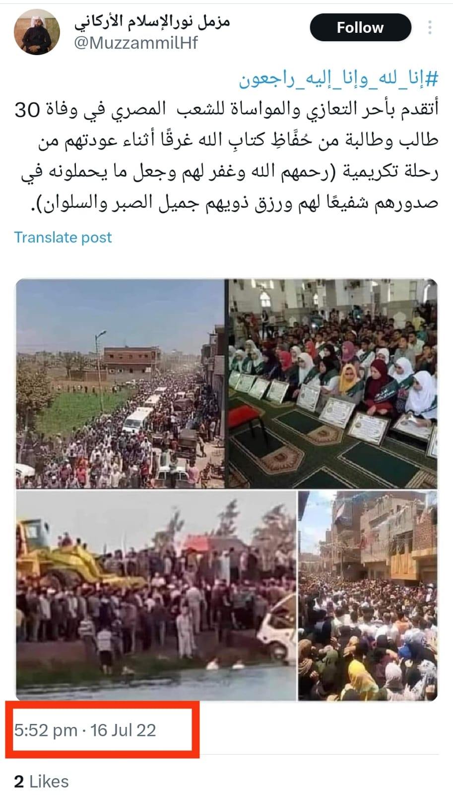 والمفارقة أن هذا الخبر المفبرك يعد من "الشائعات الموسمية"، إذ تم تداوله في 16 تموز (يوليو) 2022. وكتب أحد الحسابات حينها: "أتقدم بأحر التعازي والمواساة للشعب المصري في وفاة 30 طالباً وطالبة من حُفَّاظِ كتابِ الله غرقًا أثناء عودتهم من رحلة تكريمية (رحمهم الله وغفر لهم وجعل ما يحملونه في صدورهم شفيعًا لهم ورزق ذويهم جميل الصبر والسلوان)".