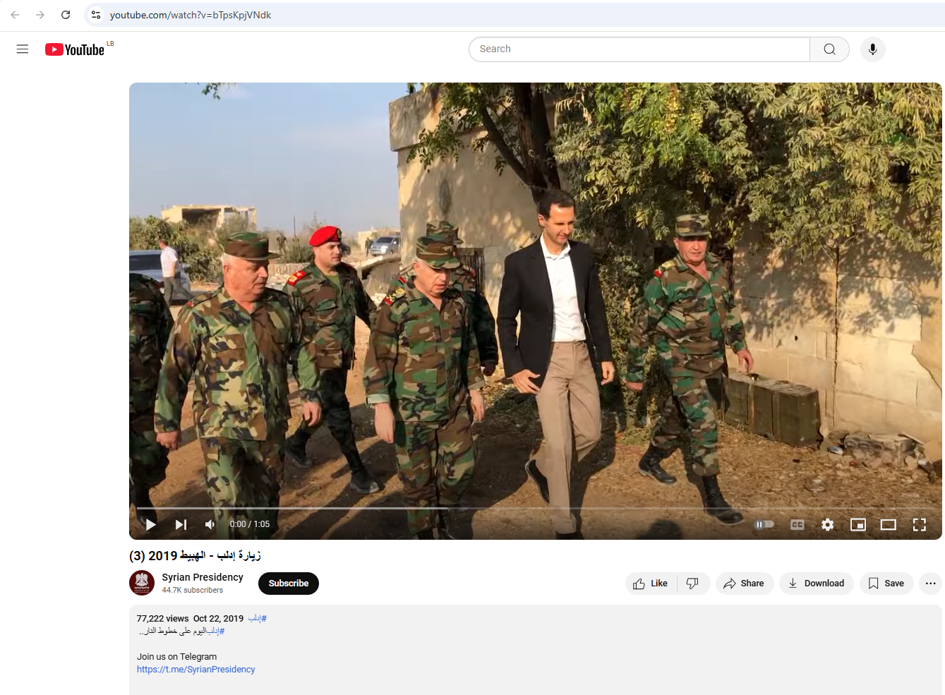 البحث عنها، بتجزئتها الى صور ثابتة (Invid)، يوصلنا اولا الى الجزء الاول منها (من التوقيت 0.00 الى 1.05) منشورا في حساب الرئاسة السورية في يوتيوب، في 22 تشرين الاول 2019، بعنوان: "زيارة إدلب- الهبيط 2019 (3)، #إدلب اليوم على خطوط النار".