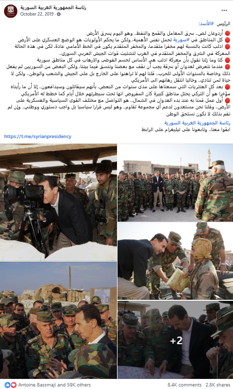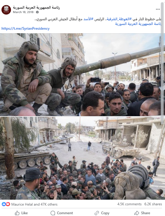 ونقلت الحسابات الرسمية للرئاسة السورية صورا للأسد وقد تجمع حوله جنود أمام دبابة في شارع بدت عليه آثار المعارك، وأرفقت الصور بتعليق: "على خطوط النار في الغوطة الشرقية... الرئيس الأسد مع أبطال الجيش العربي السوري".