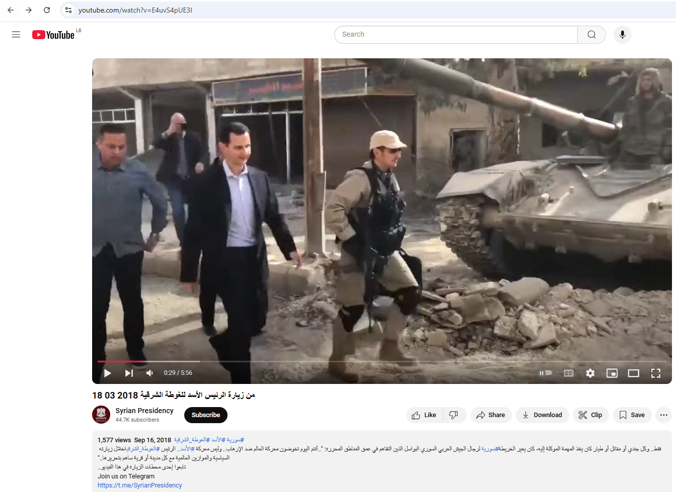 اما الجزء الثاني من المشاهد المتناقلة (من التوقيت 1.06 الى 7.10)، فنعثر عليه منشورا في حساب الرئاسة السورية في 16 ايلول 2018، بعنوان: "