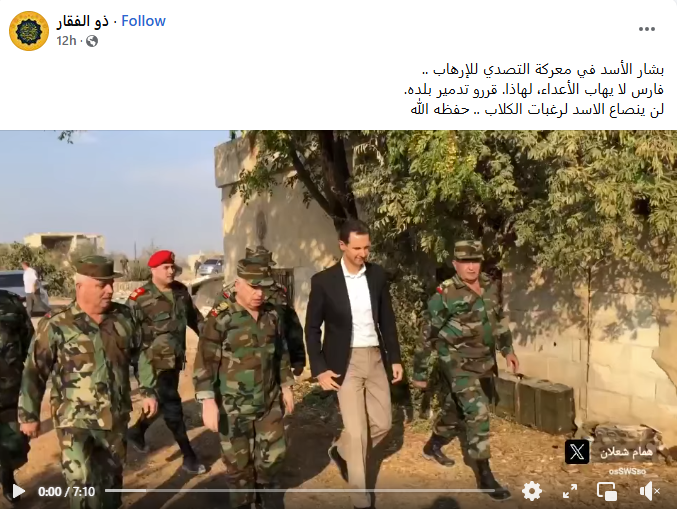 تظهر المشاهد الرئيس السوري بشار الاسد وسط عسكريين، مصافحا اياهم، متبادلا معهم الحديث، ومستمعا اليهم... وقد تكثف التشارك فيها خلال الساعات الماضية عبر حسابات ارفقتها بالتعليق الآتي (من دون تدخل): "بشار الأسد في معركة التصدي للإرهاب... فارس لا يهاب الأعداء".