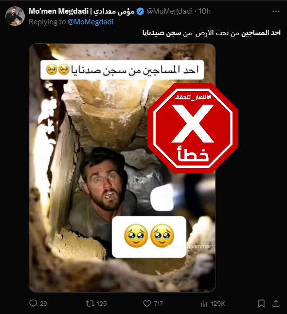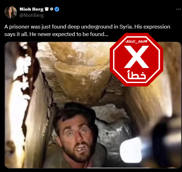 تنتشر الصورة على نطاق واسع في وسائل التواصل الاجتماعي، منذ ساعات. وما تظهره هو رجل في حفرة علت الدهشة وجهه. وارفقتها حسابات، عربية وانكليزية، بالمزاعم الآتية (من دون تدخل): "في الصورة أحد المساجين في سجن صيدنايا. رجل مندهش من رؤية وجه بشري..."، وايضا "أحد المساجين في سجن صيدنايا".
