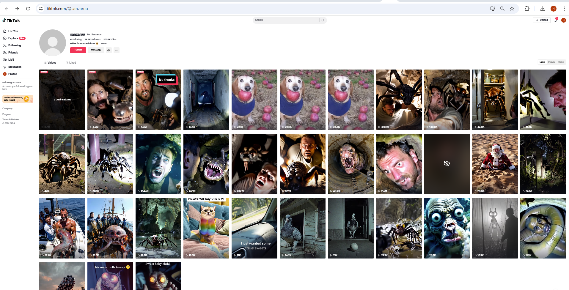 ويزخر حساب sanzaruu@ بفيديوات ذات طابع مخيف، منشأة بالذكاء الاصطناعي، وفقا لما يذكر معها.