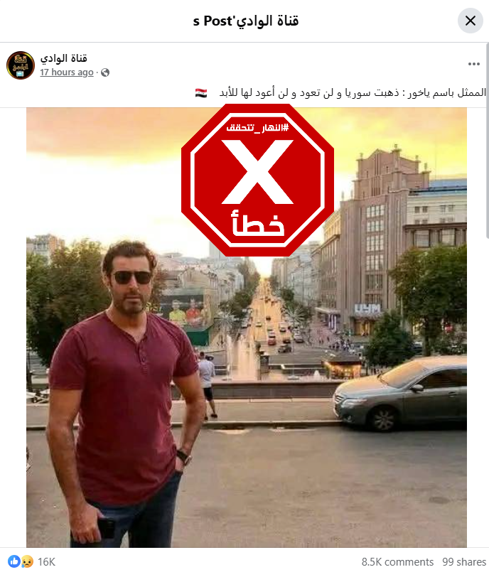 يتناقل مستخدمون لوسائل التواصل الاجتماعي تصريحا منسوبا الى الممثل السوري باسم ياخور ادعى قوله ان "سوريا ذهبت ولن تعود...". الا ان هذا التصريح مفبرك ولم يدل به ياخور. FactCheck#