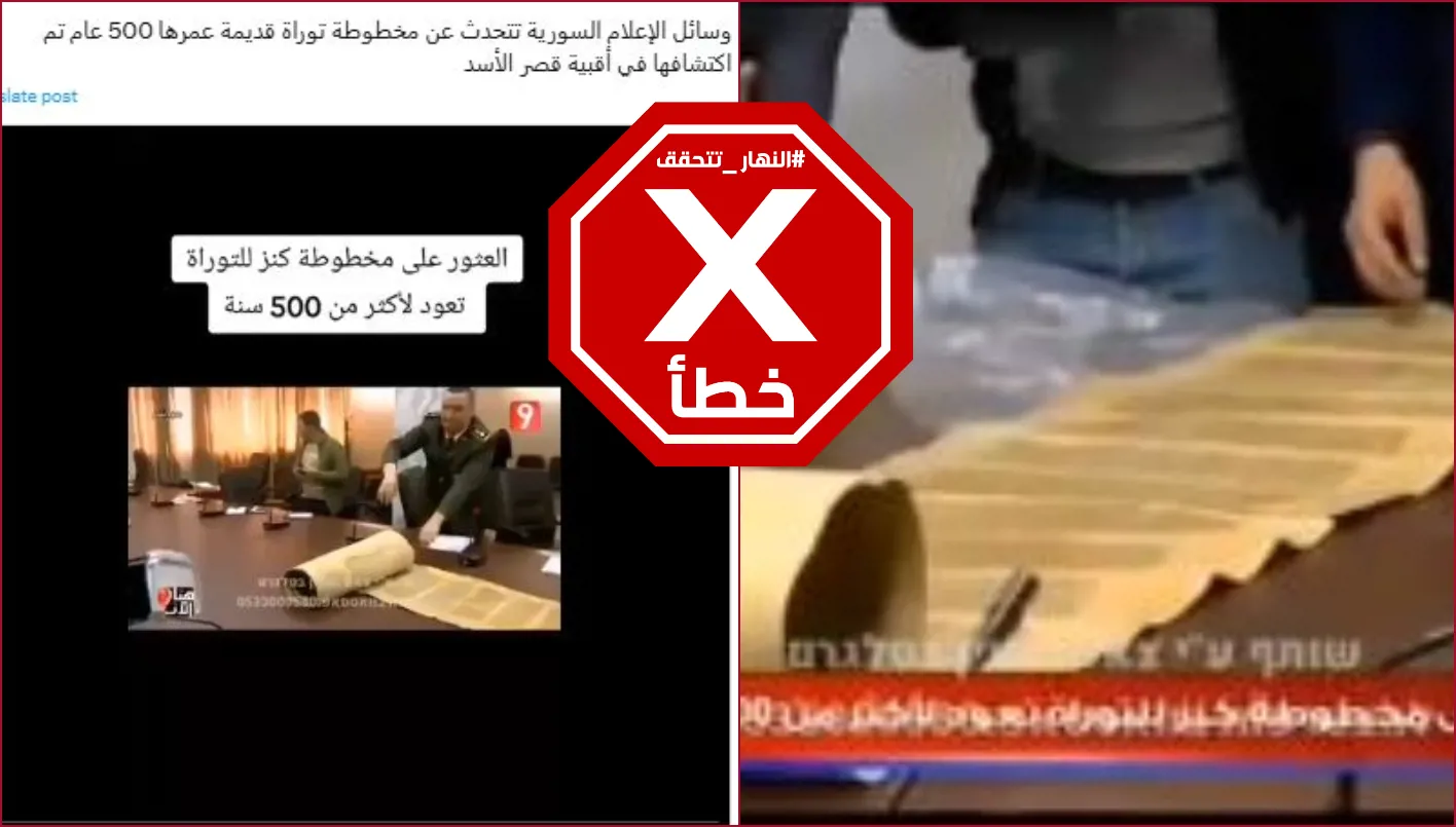 منذ ايام، ينتشر الفيديو في حسابات أرفقته بالمزاعم الآتية (من دون تدخل): "وسائل الإعلام السورية تتحدث عن مخطوطة توراة قديمة عمرها 500 عام تم اكتشافها في أقبية قصر الأسد"، وايضا "إسرائيل تبحث عن مخطوطة توراتية قديمة عمرها 500 عام في أقبية قصر الأسد".