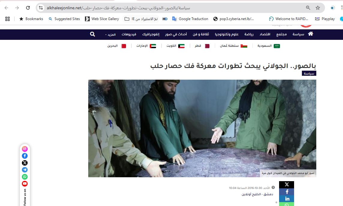 الصورة قديمة اذ تعود إلى 30 تشرين الاول 2016، وقد تداولتها وسائل إعلام يومذاك نقلاً عن مواقع "جبهة فتح الشام" التي ذكرت حينها: (دون تدخل): "الشيخ أبو محمد الجولاني يتفقد التطورات العسكرية ويناقشها مع القادة العسكريين ضمن معركة فك الحصار عن حلب".