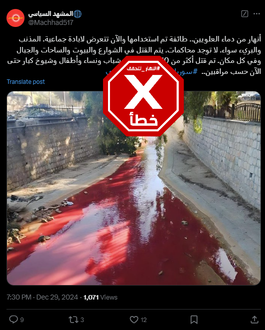 المتداول: صورة تظهر، وفقاً للمزاعم، "نهرا تلونت مياهه بالاحمر بسبب دماء علويين قتلوا في سوريا أخيرا"، بعد سقوط نظام بشار الاسد.